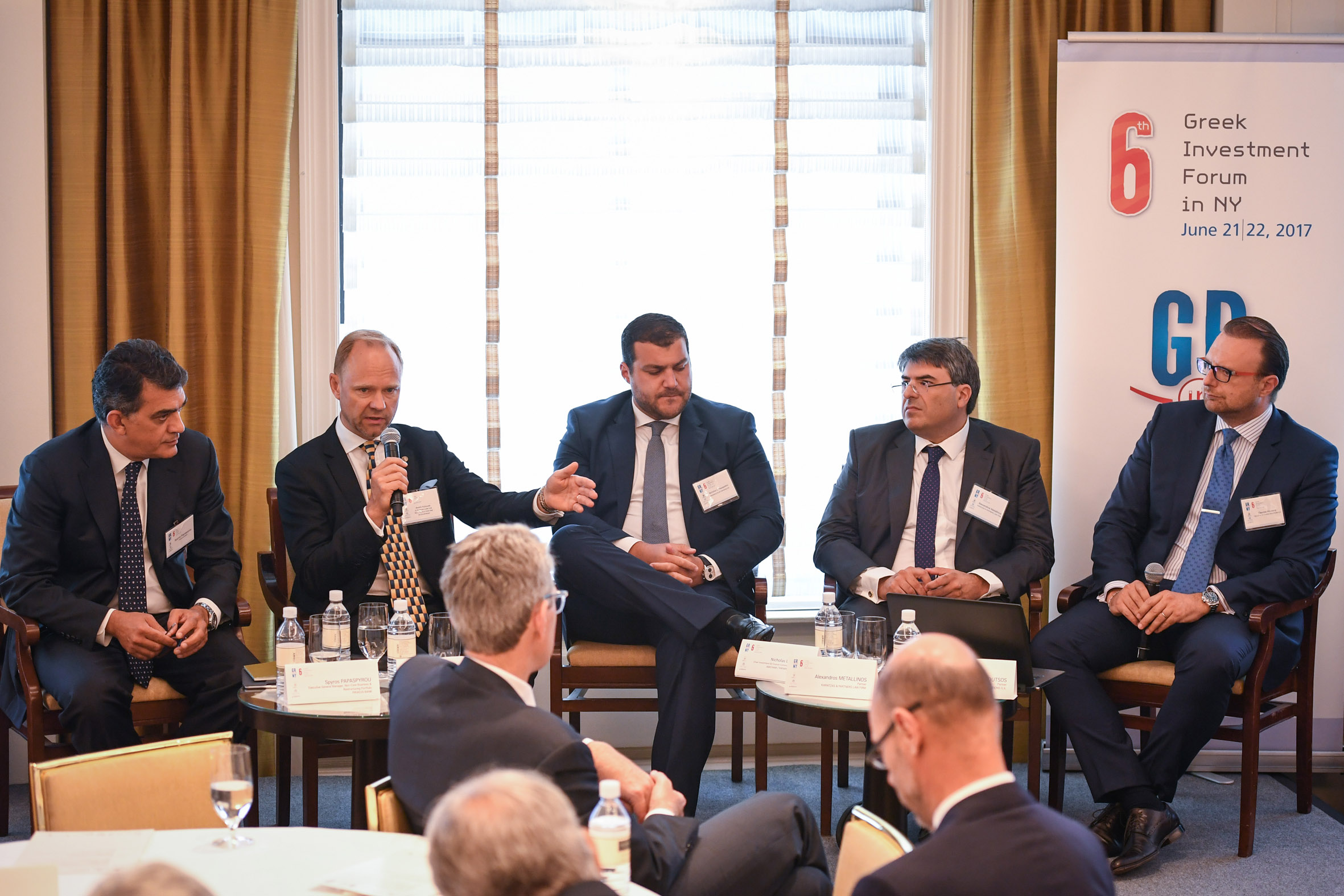 Στο πάνελ με θέμα «Επενδύοντας στην Ελλάδα: Η άποψη των ειδικών της αγοράς» συμμετείχαν οι Andre Kuusvek, Διευθυντής της EBRD, ο Σπύρος Παπασπύρου, Εκτελεστικός Γενικός Διευθυντής της Τράπεζας Πειραιώς, ο Αλέξανδρος Μεταλληνός Εταίρος της δικηγορικής εταιρείας Karatzas & Partners και ο Νικόλας Παπαπολίτης, Διευθύνων Σύμβουλος της δικηγορικής εταιρείας Papapolitis & Papapolitis. Συντονιστής του πάνελ των ομιλητών ήταν ο κ. Γιώργος Κουτσός, Εταίρος της Deloitte Business Solution.