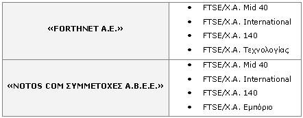 Υπενθυμίζεται, ότι οι μετοχές των εταιρειών "FORTHNET Α.Ε." και "NOTOS COM ΣΥΜΜΕΤΟΧΕΣ Α.Β.Ε.Ε." συμμετέχουν στους ακόλουθους Δείκτες FTSE/X.A.: