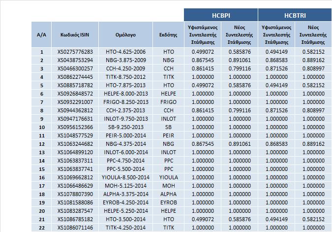 Οι νέοι συντελεστές στάθμισης των ομολόγων που συμμετέχουν στη σύνθεση του Δείκτη είναι οι ακόλουθοι: