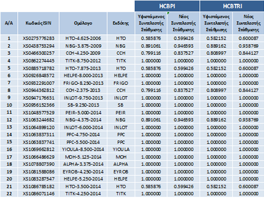 Το Χρηματιστήριο Αθηνών ανακοινώνει τις αλλαγές στη σύνθεση των Δεικτών Ελληνικών Εταιρικών Ομολόγων καθώς και τους συντελεστές στάθμισης των ομολόγων που συμμετέχουν στη σύνθεση των Δεικτών στο πλαίσιο των Βασικών Κανόνων.