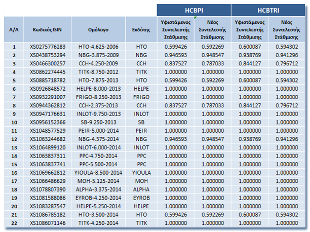 Το Χρηματιστήριο Αθηνών ανακοινώνει τις αλλαγές στη σύνθεση των Δεικτών Ελληνικών Εταιρικών Ομολόγων καθώς και τους συντελεστές στάθμισης των ομολόγων που συμμετέχουν στη σύνθεση των Δεικτών στο πλαίσιο των Βασικών Κανόνων.
