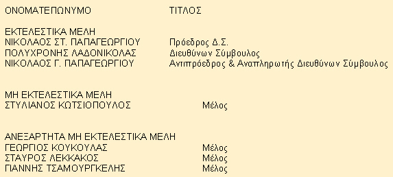 Σύμφωνα με το Αρθρο 4 παρ. 1 στοιχείο ε της Απόφασης Επιτροπής Κεφαλαιαγοράς 5/204/14.11.2000 σας γνωστοποιούμε ότι έχει προκύψει αλλαγή στη σύνθεση του Δ.Σ. της Εταιρίας μας. Παραθέτουμε το νέο Δ.Σ. της Εταιρίας (με τη μορφή 'Όνομα, Τίτλος').