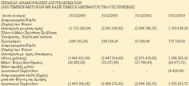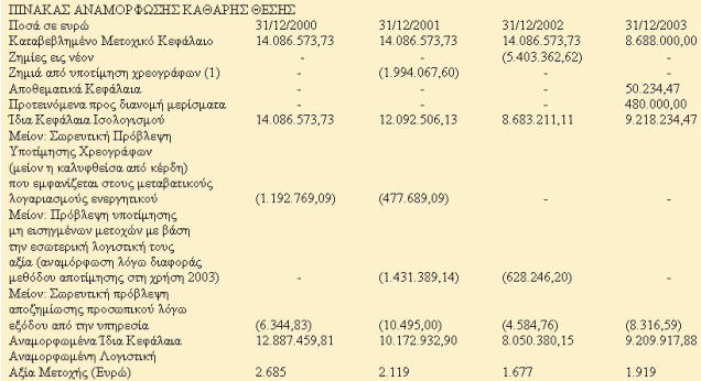 1) Η αναμορφωμένη καθαρή θέση της εταιρείας στις 31/12/2000, 31/12/2001, 31/12/2002 και 31/12/2003 και η