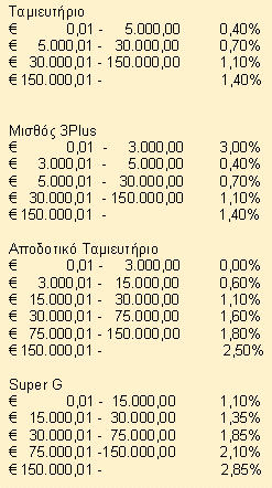 Στον καταθετικό / επενδυτικό λογαριασμό "Super G" τα επιτόκια των κλιμακίων μειώθηκαν κατά 0,40 εκατοστιαίες μονάδες, κλιμακούμενα από 1,10% μέχρι 2,85%.