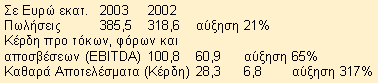 ΑΥΞΗΣΗ 31,4% ΤΩΝ ΚΕΡΔΩΝ ΠΡΟ ΤΟΚΩΝ ΚΑΙ ΑΠΟΣΒΕΣΕΩΝ (EBITDA) ΣΕ ΕΥΡΩ 31 ΕΚΑΤ. ΚΑΙ ΑΥΞΗΣΗ 22% ΣΤΑ ΚΑΘΑΡΑ ΚΕΡΔΗ ΣΕ ΕΥΡΩ 4,9 ΕΚΑΤ. ΤΟΥ ΟΜΙΛΟΥ ΓΡΑΜΜΕΣ ΣΤΡΙΝΤΖΗ (BLUE STAR FERRIES) ΤΟ 2003