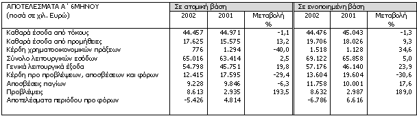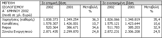 Στον πίνακα που ακολουθεί εμφανίζονται τα μεγέθη που διαμορφώνουν τα αποτελέσματα της Τράπεζας στο Α΄ εξαμήνου του 2002 και η εξέλιξη τους σε σχέση με την αντίστοιχη περίοδο του προηγούμενου έτους: