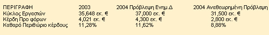 Με βάση τον αναθεωρημένο προϋπολογισμό για το 2004, αναμένονται πωλήσεις ευρώ 31,5 εκατ., με καθαρά κέρδη προ φόρων ευρώ 2,8 εκατ.