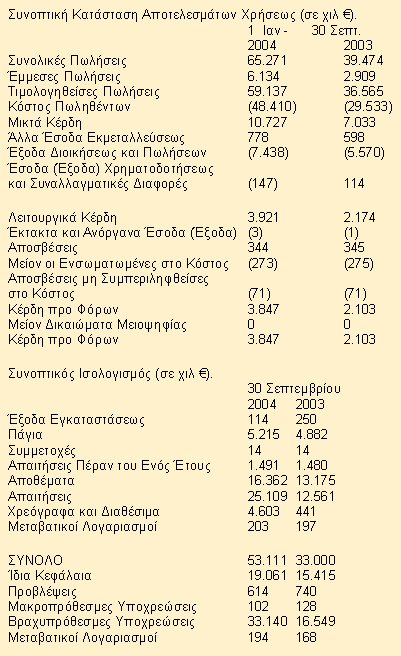 Οι συνολικές πωλήσεις του Ομίλου κατά την περίοδο 1η Ιανουαρίου - 30 Σεπτεμβρίου αυξήθηκαν κατά 65.4% έναντι της αντίστοιχης περιόδου του 2003 και ανήλθαν σε ευρώ 65,2 εκ. (ευρώ 39,4 εκ. το 2003). Οι τιμολογηθείσες πωλήσεις του Ομίλου κατά την ίδια περίοδο αυξήθηκαν κατά 61.9% και ανήλθαν σε ευρώ 59,1 εκ. (ευρώ 36,5 εκ. το 2003). Τα καθαρά κέρδη προ φόρων ανήλθαν σε ευρώ 3.847.462 (ευρώ 2.102.672), σημειώνοντας αύξηση 83%.