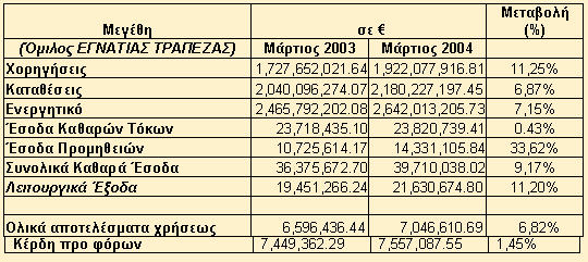 Τα προ φόρων κέρδη του Ομίλου της ΕΓΝΑΤΙΑΣ ΤΡΑΠΕΖΑΣ το πρώτο τρίμηνο του 2004 διαμορφώθηκαν στα 7,56 εκ ευρώ έναντι 7,45 εκ ευρώ κατά το πρώτο τρίμηνο του 2003, παρουσιάζοντας αύξηση κατά 1,45%.
