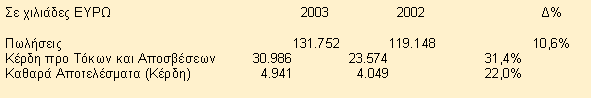 Αύξηση πωλήσεων κατά 10,6% και καθαρών κερδών κατά 22% σε σύγκριση με το 2002