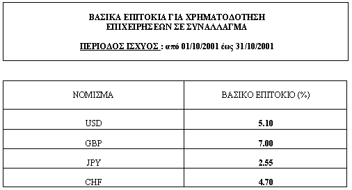 O Όμιλος Πειραιώς αναπροσαρμόζει τα βασικά επιτόκιά του, για χρηματοδότηση Επιχειρήσεων σε Συνάλλαγμα, τα οποία για την περίοδο 01/10/2001 έως 31/10/2001 αναφέρονται στον παρακάτω πίνακα: