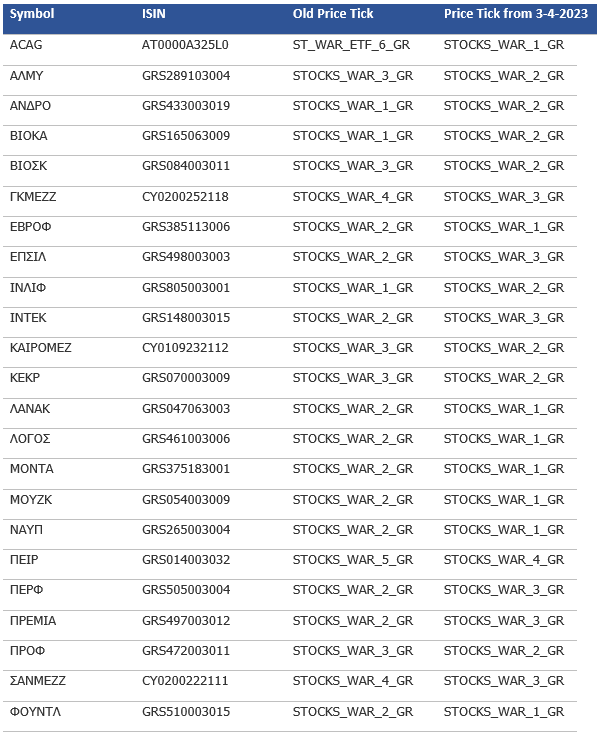 Από την αξιολόγηση της ESMA σχετικά με το Μέσο Ημερήσιο Αριθμό Συναλλαγών των αξιών που διαπραγματεύονται στις αγορές του ΧΑ, προκύπτουν αλλαγές στο Βήμα τιμής ορισμένων διαπραγματεύσιμων προϊόντων, σύμφωνα με τον παρακάτω πίνακα: