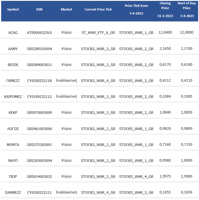 Βάσει της παραπάνω αλλαγής στο βήμα τιμής των διαπραγματεύσιμων προϊόντων ΧΑ, προκύπτουν οι εξής αλλαγές στη τιμή εκκίνησης των παρακάτω προϊόντων: