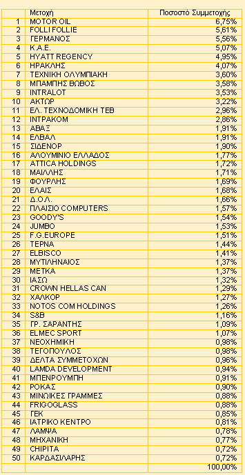 - Οι μετοχές των εταιριών που εναρμονίζονται με τις παραπάνω προϋποθέσεις θα καταταχθούν σύμφωνα με την κεφαλαιοποίησή τους με βάση τις τιμές κλεισίματος στο Χ.Α. της τελευταίας συνεδρίασης του Σεπτεμβρίου 2004. Οι πρώτες 50 μετοχές στην κατάταξη θα συμμετέχουν στην πρώτη διάρθρωση του Δείκτη με ποσοστό ανάλογο της συμμετοχής τους επί της συνολικής κεφαλαιοποίησης του Δείκτη.