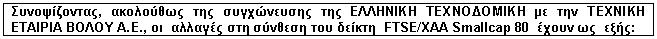 Λόγω της συγχώνευσης της ΕΛΛΗΝΙΚΗ ΤΕΧΝΟΔΟΜΙΚΗ Α.Ε. με ΤΕΧΝΙΚΗ ΕΤΑΙΡΙΑ ΒΟΛΟΥ Α.Ε. και ως εκ τούτου την διακοπή διαπραγμάτευσης της μετοχής ΤΕΧΝΙΚΗ ΕΤΑΙΡΙΑ ΒΟΛΟΥ Α.Ε. από τις 29 Ιουλίου 2002, θα πραγματοποιηθούν οι ακόλουθες αλλαγές: η μετοχή της ΤΕΧΝΙΚΗ ΕΤΑΙΡΙΑ ΒΟΛΟΥ Α.Ε. στο Δείκτη FTSE/XAA SMALLCAP 80 θα αντικατασταθεί από την μετοχή ΟΠΑΠ ΑΕ. Η μετοχή αυτή ήταν η πρώτη επιλαχούσα με βάση την ανάλυση των κριτηρίων των δεικτών κατά την 25η Ιουλίου 2002, που διεξήχθη σύμφωνα με το σημείο 7.2.2 των Βασικών Κανόνων Διαχείρισης & Υπολογισμού των Δεικτών FTSE/XAA 20, FTSE/XAA MID 40 & FTSE/XAA SMALLCAP.