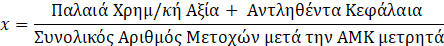 Προς διευκόλυνση, παρατίθεται ο τύπος υπολογισμού της προσαρμοσμένης τιμής εκκίνησης της μετοχής, που εφαρμόζεται βάσει της Απόφασης 26 του ΔΣ του Χ.Α. για κάθε αύξηση μετοχικού κεφαλαίου (ΑΜΚ) με καταβολή μετρητών υπέρ των παλαιών μετόχων της εταιρίας: