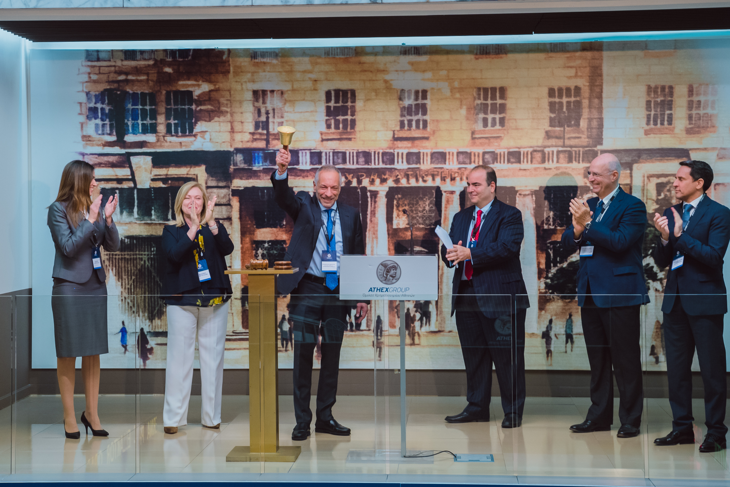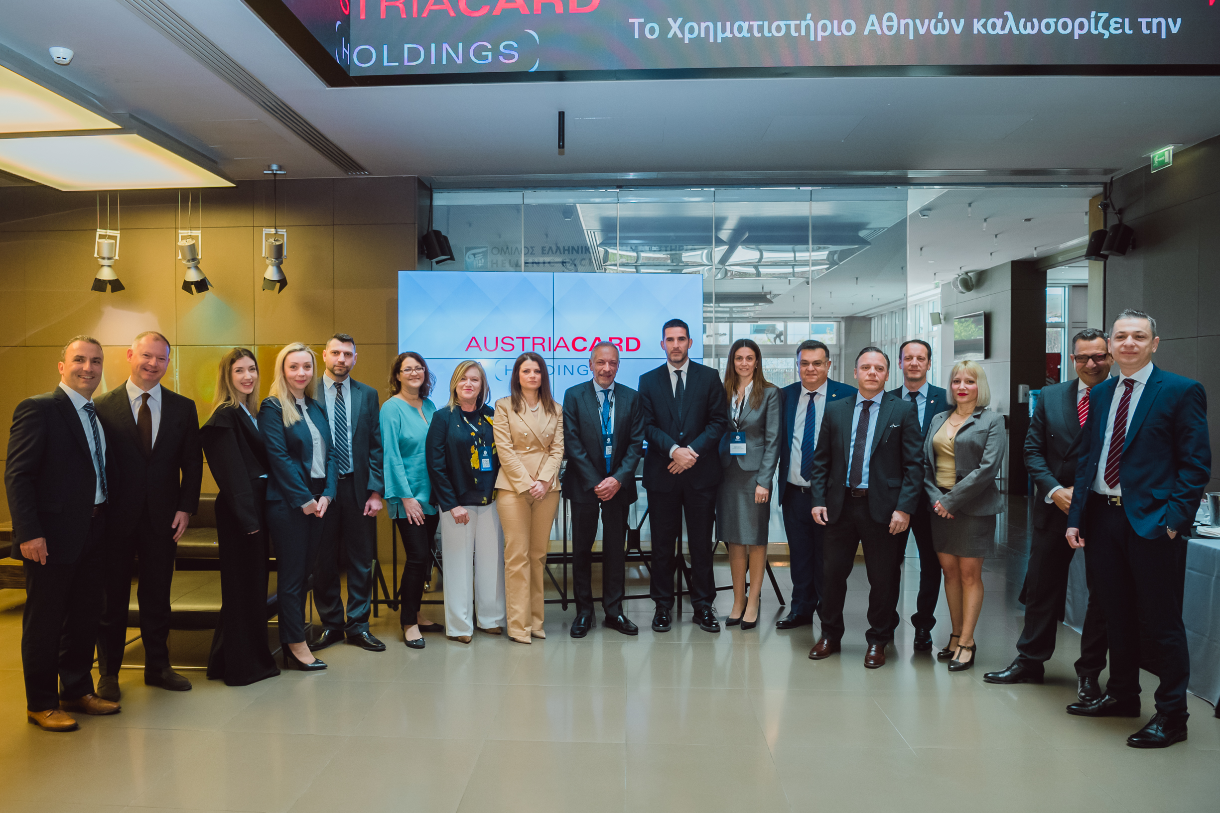 To Χρηματιστήριο Αθηνών υποδέχθηκε σήμερα την Διοίκηση και στελέχη της ΑUSTRIACARD HOLDINGS AG με αφορμή την παράλληλη έναρξη διαπραγμάτευσης των μετοχών της στα Χρηματιστήρια Αθηνών και Βιέννης. Ο Group CEO της εταιρείας κ. Παναγιώτης Σπυρόπουλος κήρυξε την έναρξη της συνεδρίασης του Χρηματιστηρίου.