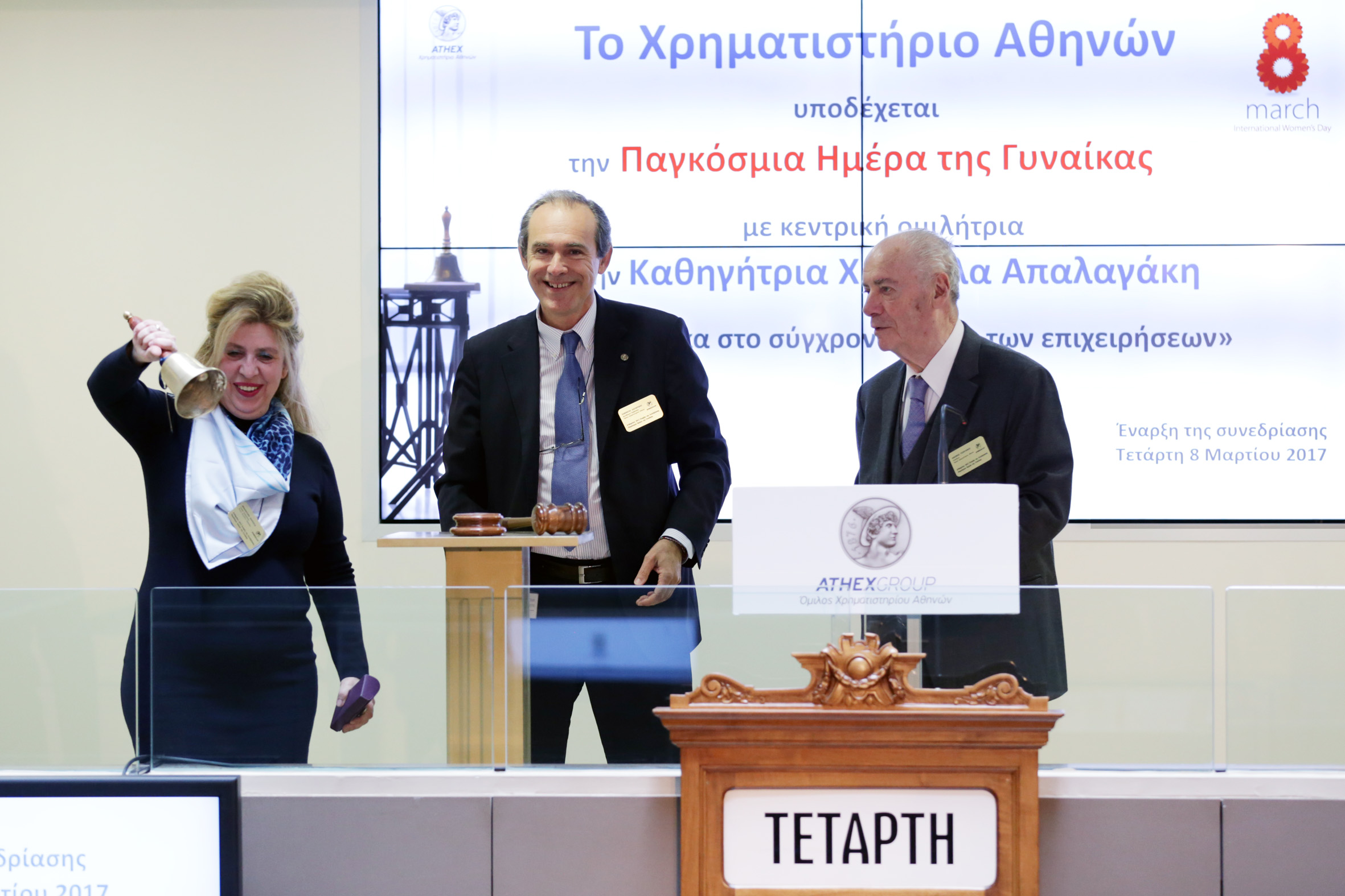 Ο Διευθύνων Σύμβουλος του Χρηματιστηρίου Αθηνών κ. Σωκράτης Λαζαρίδης, παραδίδοντας το αναμνηστικό καμπανάκι - παραδοσιακό σύμβολο της Έναρξης της συνεδρίασης - σημείωσε: «Είναι μεγάλη μας χαρά και τιμή που η καθηγήτρια κα Απαλαγάκη, Γενική Γραμματέας της Ένωσης Ελληνικών Τραπεζών και σημαντική προσωπικότητα τόσο του ακαδημαϊκού όσο και τραπεζικού χώρου, θα κηρύξει σήμερα την Έναρξη της Συνεδρίασης του Χρηματιστηρίου η οποία συμπίπτει με την Παγκόσμια Ημέρα της Γυναίκας.