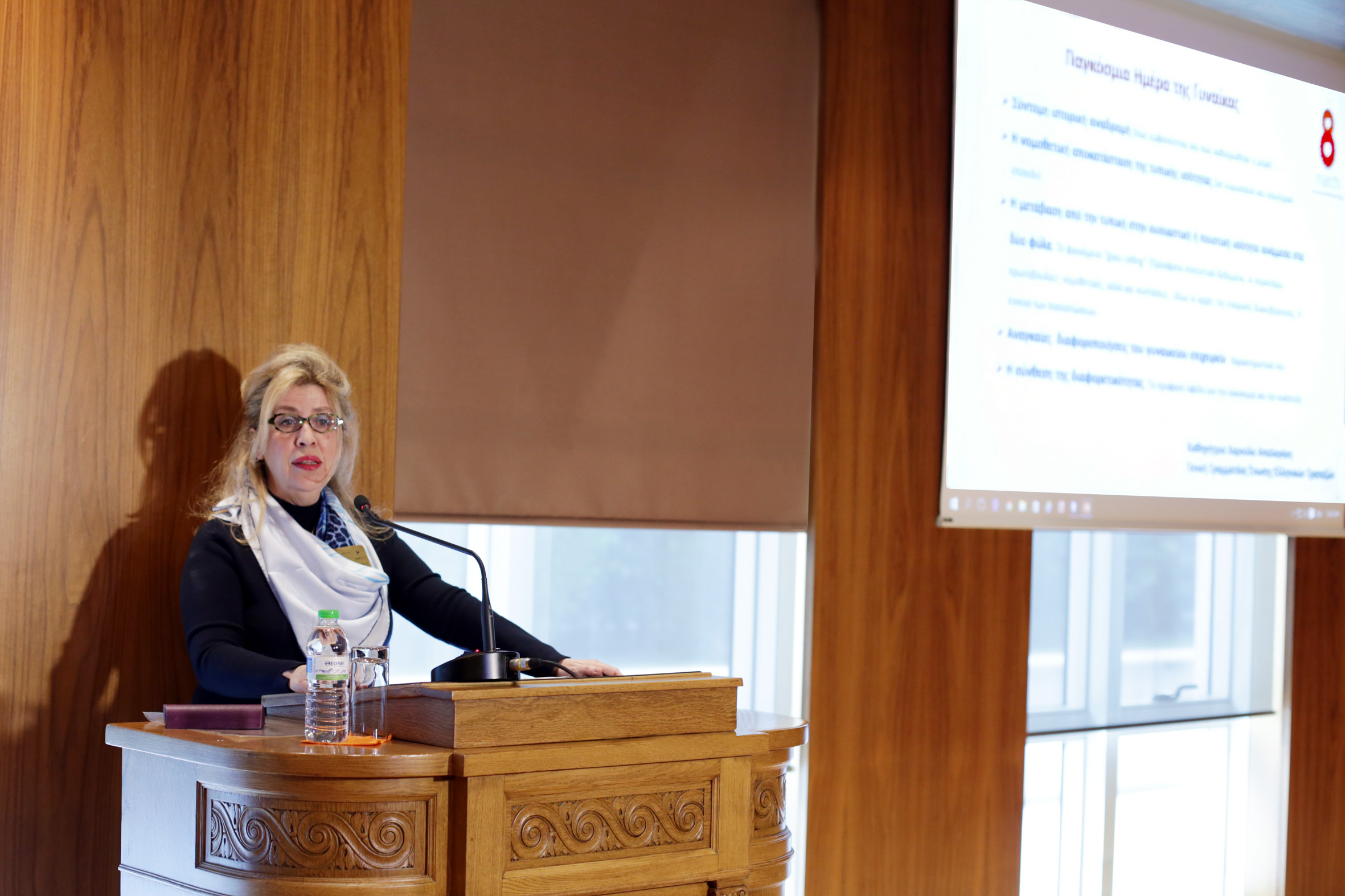 Παγκόσμια Ημέρα της Γυναίκας, στην τελετή Έναρξης της συνεδρίασης την Καθηγήτρια κυρία Χαρούλα Απαλαγάκη, Γενική Γραμματέα της Ένωσης Ελληνικών Τραπεζών (ΕΕΤ).