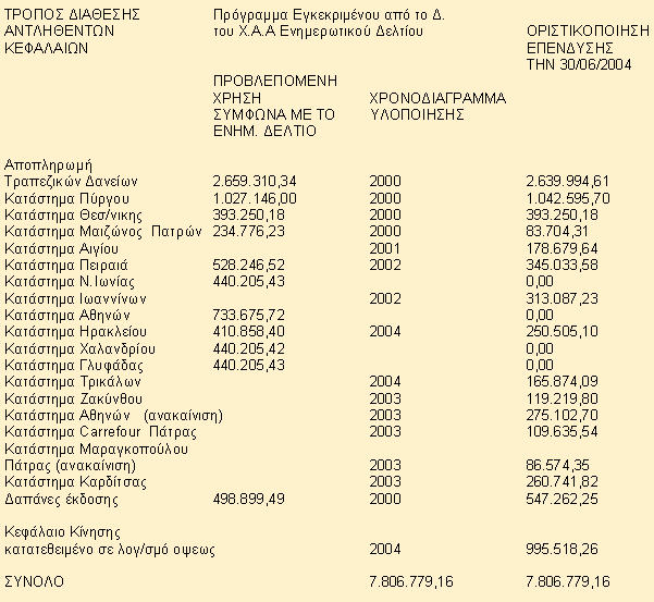 Όπως εισηγήθηκε το Διοικητικό Συμβούλιο κατόπιν λεπτομερούς μελέτης των κεντρικών σημείων πώλησης για μελλοντικές επενδύσεις νέων καταστημάτων, αποδείχθηκε λόγω των νέων συνθηκών που έχουν διαμορφωθεί στην αγορά ότι είναι υπέρογκο το κόστος δημιουργίας τους (αέρας, ενοίκιο, κόστος κατασκευής, δαπάνες προσωπικού και λοιπά λειτουργικά έξοδα) συγκρινόμενο με το προσδοκώμενο όφελος από την πώληση των προιόντων μας. Για τον λόγο αυτό αποφασίστηκε η οριστικοποίηση των ήδη υπαρχόντων επενδύσεων καθώς και αυτών που θα ολοκληρωθούν έως την 30-6-2004. Το δε αδιάθετο υπόλοιπο από τα αντληθέντα κεφάλαια θα χρησιμοποιηθεί ως κεφάλαιο κίνησης της εταιρείας.