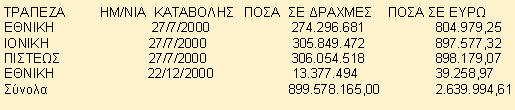 Η καταβολή του ποσού των 2.639.994,61 έγινε στις παρακάτω τράπεζες και ημερομηνίες: