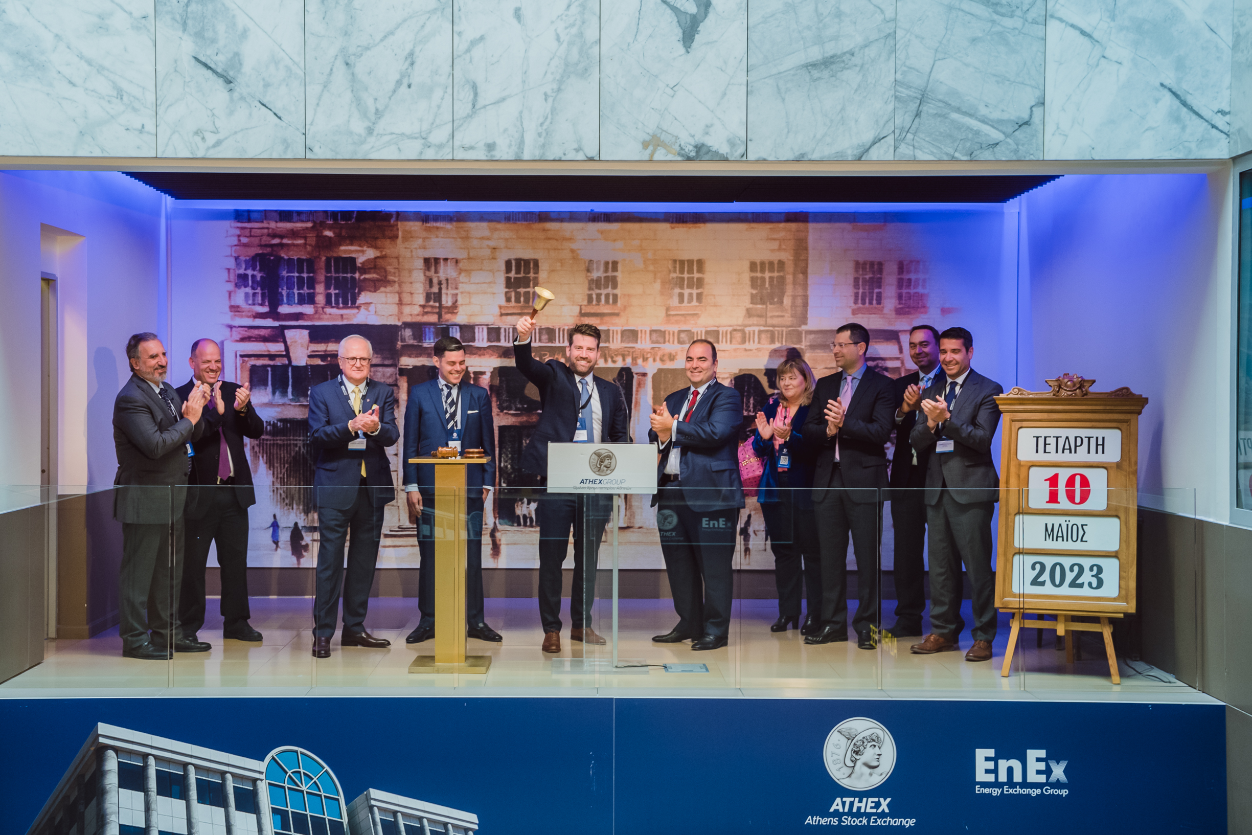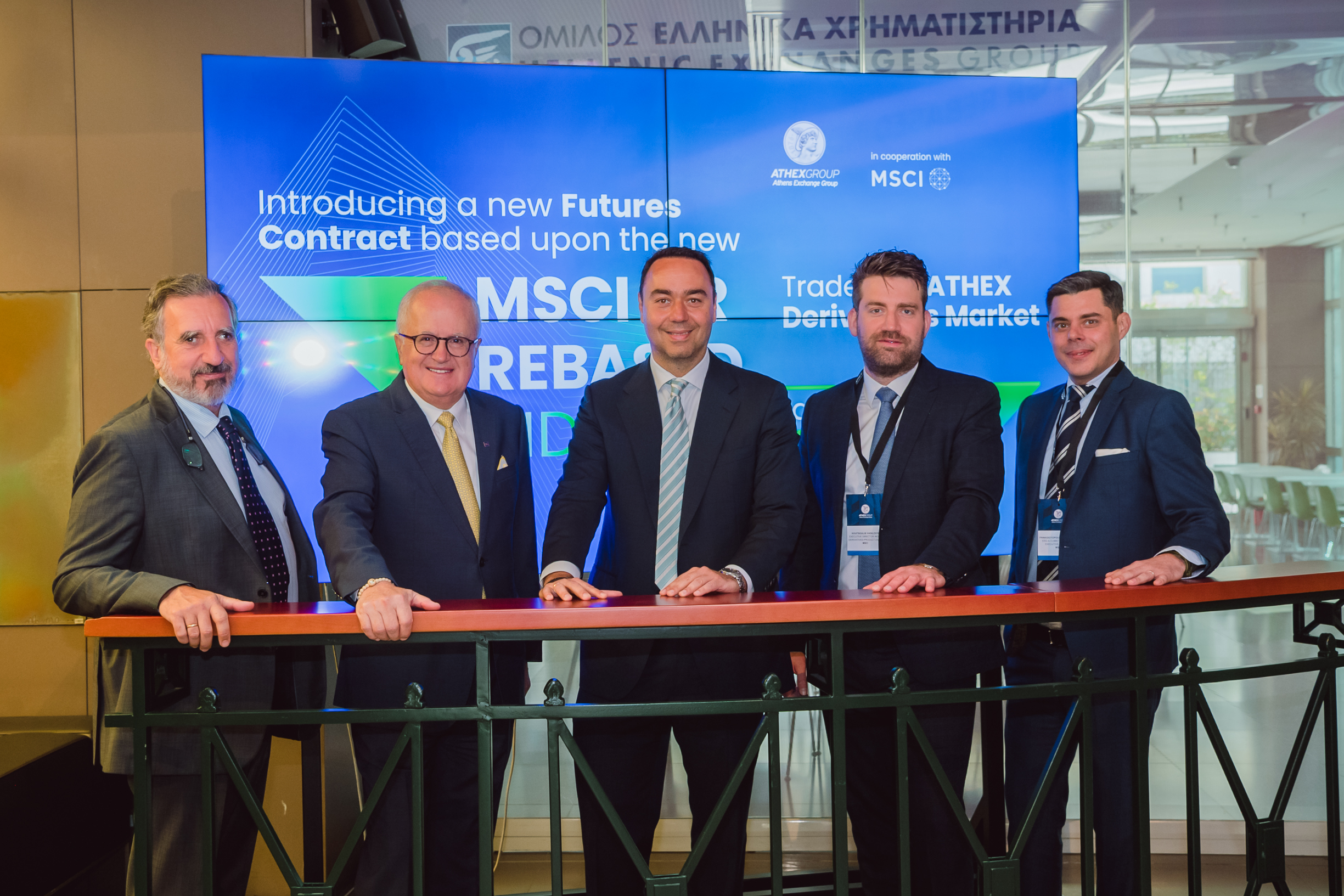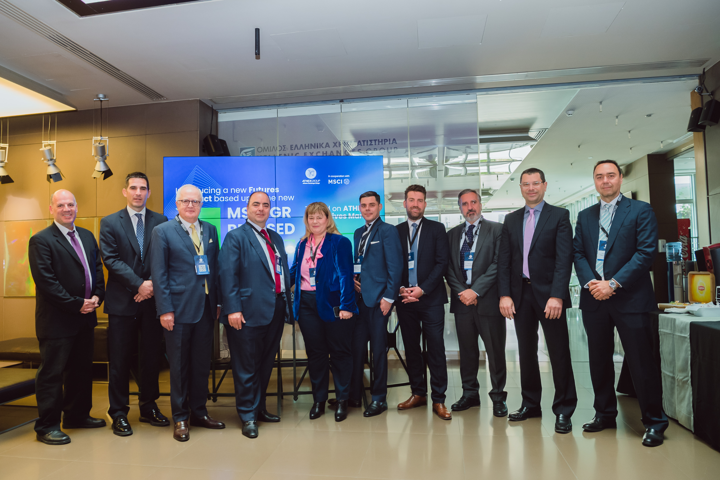 Το Χρηματιστήριο Αθηνών υποδέχθηκε σήμερα στελέχη του MSCI αλλά και χρηματιστηριακών εταιρειών, με αφορμή την έναρξη διαπραγμάτευσης του νέου Συμβολαίου Μελλοντικής Εκπλήρωσης που συνδέεται με τον νέο MSCI GR Rebased Index. Οι κ.κ. Βασίλειος Κουτσουλής, Executive Director, Index Derivatives Product-EMEA, MSCI και Αντώνιος Παναγιωτόπουλος, ESG & Climate Research, Executive Director, MSCI, κήρυξαν την έναρξη της συνεδρίασης χτυπώντας το παραδοσιακό καμπανάκι.