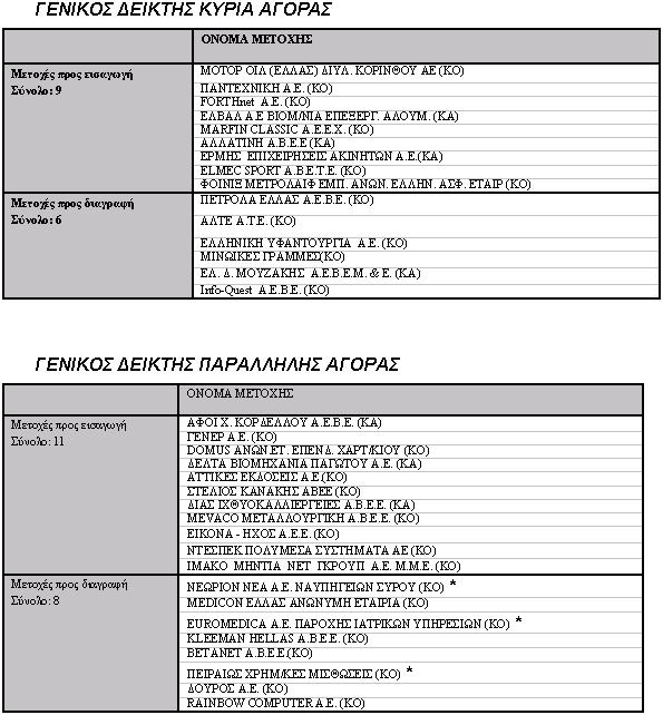 Σημείωση: Οι μετοχές που φέρουν αστερίσκο (*) σύμφωνα με την από 5/5/2003 ανακοίνωση του Χρηματιστηρίου Αθηνών θα διαπραγματεύονται από 2/6/2003 στην συνεχή διαπραγμάτευση τριών ωρών. Ως εκ τούτου, σύμφωνα και με την από 17/4/2003 σχετική ανακοίνωση, οι μετοχές αυτές δεν δύνανται να συμμετέχουν στους Γενικούς Δείκτες Αγοράς και στους κλαδικούς Δείκτες.