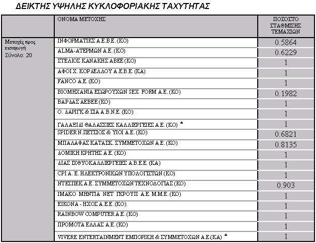Επίσης εισάγεται ο νέος δείκτης υψηλής κυκλοφοριακής ταχύτητας με ημερομηνία βάσης του δείκτη την 30/05/2003 και τιμή εκκίνησης τις 1000 μονάδες.