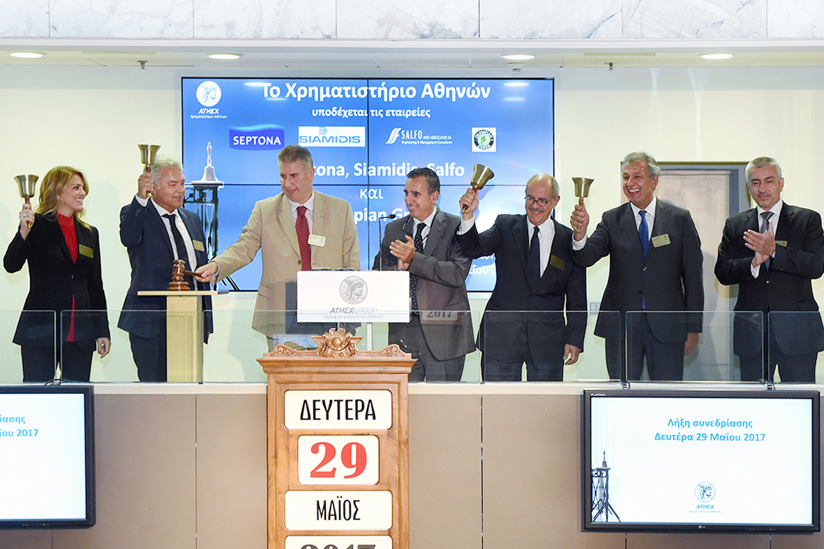Τη Δευτέρα 29 Μαΐου 2017 και ώρα 5:30, το παραδοσιακό καμπανάκι για τη λήξη της συνεδρίασης στο Χρηματιστήριο Αθηνών σήμαναν η κα Κωνσταντίνα Ευαγγελίου, Διευθύνουσα Σύμβουλος της Septona, ο κ. Μιχάλης Σιαμίδης, Διευθύνων Σύμβουλος της Siamidis, ο κ. Γεώργιος Σαλπέας, Πρόεδρος της Salfo & Associates, ο κ. Φώτης Μαυρουδής, Γενικός Διευθυντής της Olympian Green International και ο Πρόεδρος της Ένωσης Διπλωματικών Υπαλλήλων Οικονομικών και Εμπορικών Υποθέσεων (ΕΝΔΥ ΟΕΥ), κ. Λεωνίδας Παπακωνσταντινίδης.
