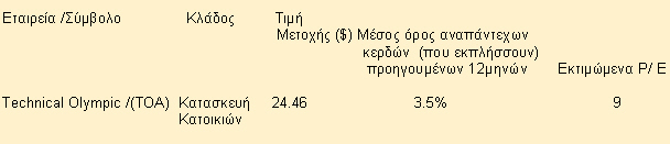 Η διεύθυνση του ομίλου της ΤΕΧΝΙΚΗΣ ΟΛΥΜΠΙΑΚΗΣ, ανακοινώνει, ότι η αμερικανική θυγατρική της εταιρεία TECHNICAL OLYMPIC USA INC. (TOUSA), εισηγμένη στο χρηματιστήριο της Νέας Υόρκης (NYSE), σύμφωνα με πρόσφατο άρθρο (5-4-05) της έγκυρης οικονομικής εφημερίδας WALL STREET JOURNAL με τίτλο «SmartMoney Stock Screen / Unheard of Stocks? για την εξεύρεση αφανών μετοχών (μη προβεβλημένων) οι οποίες μπορεί σύντομα να προσελκύουν μεγαλύτερο ενδιαφέρον στην Wall Street, κατατάσσεται μεταξύ των οκτώ εταιρειών στην λίστα των «Undercovered Companies?, οι οποίες σύντομα, λόγω του ρυθμού αύξησης των κερδών τους και της αποτίμησης των μετοχών τους, θα προσελκύσουν μεγαλύτερο ενδιαφέρον από την πλευρά των αναλυτών.