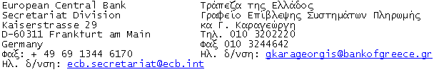 Παρακαλούμε να αποστείλετε τα σχόλιά σας στην ακόλουθη διεύθυνση της ΕΚΤ ή στην οικεία εθνική κεντρική τράπεζα: