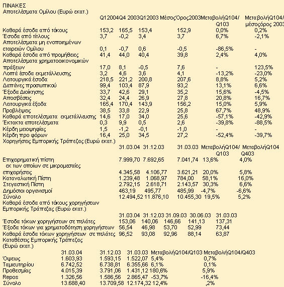 Το πρώτο τρίμηνο του 2004, τα καθαρά έσοδα από τόκους ανήλθαν σε Ευρώ 153,2 εκατ. και παρέμειναν αμετάβλητα έναντι του αντίστοιχου τριμήνου του 2003. Το καθαρό επιτοκιακό περιθώριο παρέμεινε σχεδόν αμετάβλητο στο 3,47%.