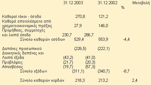 Τα καθαρά κέρδη χρήσεως ανήλθαν σε 218,3 εκατ. ευρώ έναντι 213,2 εκατ. ευρώ κατά την προηγούμενη χρήση, σημειώνοντας αύξηση κατά 2,4%. Το αποτέλεσμα αυτό κρίνεται ικανοποιητικό εάν ληφθεί υπόψη ότι κατά τη χρήση του έτους 2003 επικράτησαν συνθήκες ιδιαίτερα δυσμενείς για τις κεντρικές τράπεζες, κυρίως λόγω της υποτίμησης του δολαρίου ΗΠΑ έναντι του ευρώ, η οποία επηρέασε αρνητικά την αξία των περιουσιακών τους στοιχείων που είναι εκπεφρασμένα σε δολάρια ΗΠΑ, καθώς και της μείωσης των εγχώριων και διεθνών ε πιτοκίων.