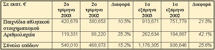 Η σταθερή απόδοση των παιχνιδιών μας συνολικά κατά το δεύτερο τρίμηνο απέφερε έσοδα ύψους 1.176,3 εκ. ευρώ για το πρώτο εξάμηνο του 2003 σε σύγκριση με 936,6 εκ. ευρώ για την αντίστοιχη περίοδο του προηγούμενου έτους, παρουσιάζοντας αύξηση της τάξεως του 25,6%.