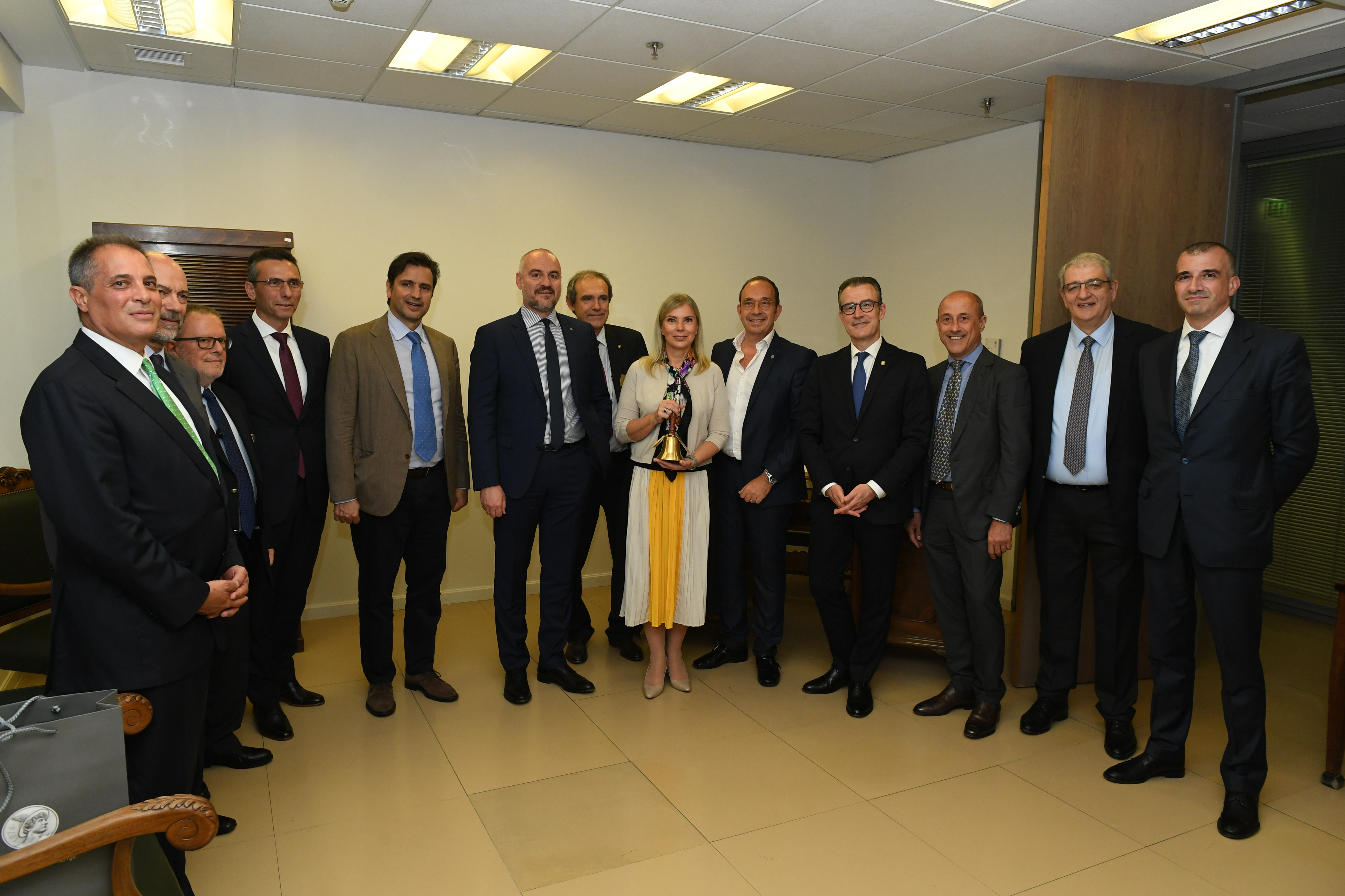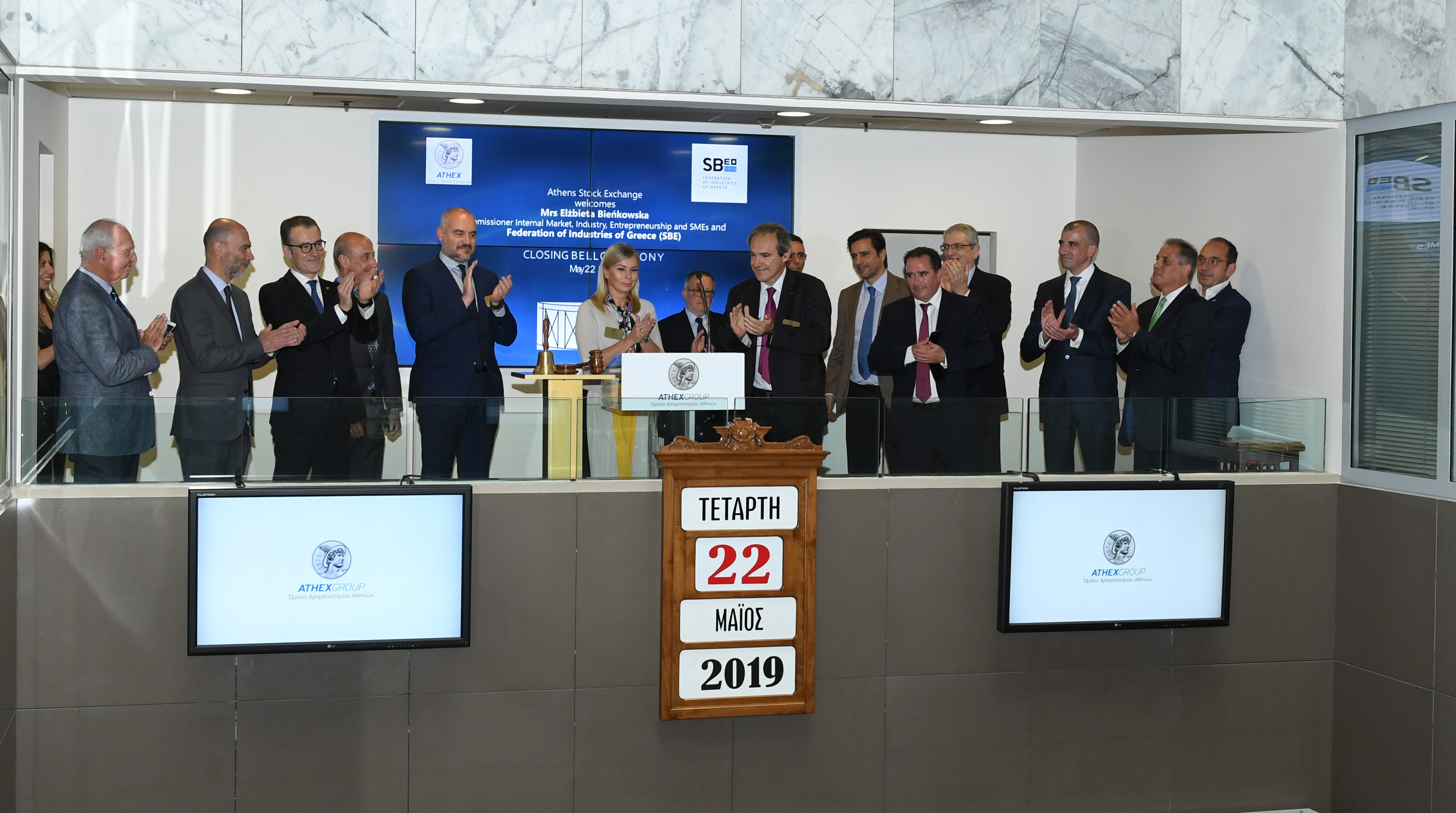 Το Χρηματιστήριο Αθηνών υποδέχθηκε σήμερα Τετάρτη 22 Μαΐου 2019 την Επίτροπο κα Elzbieta Βienkowska αρμόδια για θέματα «Εσωτερικής Αγοράς, Βιομηχανίας, Επιχειρηματικότητας και Μικρών & Μεσαίων Επιχειρήσεων» της Ευρωπαϊκής Επιτροπής και τον κ. Αθανάσιο Σαββάκη, Πρόεδρο του Συνδέσμου Βιομηχανιών Ελλάδος. Η κυρία Βienkowska χτύπησε το παραδοσιακό καμπανάκι για τη λήξη της συνεδρίασης της αγοράς.