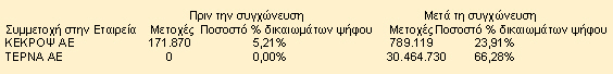 Σας ενημερώνουμε ότι μετά την συγχώνευση με απορρόφηση της εταιρείας "ΓΕΝΙΚΗ ΕΤΑΙΡΕΙΑ ΚΑΤΑΣΚΕΥΩΝ ΑΕ" από την εταιρεία "ΓΕΚ Ανώνυμη Εταιρεία Συμμετοχών, Ακινήτων, Κατασκευών" (πρώην ΕΡΜΗΣ ΕΠΙΧΕΙΡΗΣΕΙΣ ΑΚΙΝΗΤΩΝ ΑΕ) η οποία εγκρίθηκε από το Διοικητικό Συμβούλιο του Χρηματιστηρίου Αθηνών στη συνεδρίασή του της 2/12/2004 και από το Υπ. Ανάπτυξης με την υπ αριθμ. 13956 απόφαση της 3/12/2004 μετεβλήθη το ποσοστό συμμετοχής της απορροφώσας εταιρείας στις εταιρείες "ΚΕΚΡΟΨ ΑΕ" και "ΤΕΡΝΑ ΑΕ" τα οποία διαμορφώνονται ως εξής: