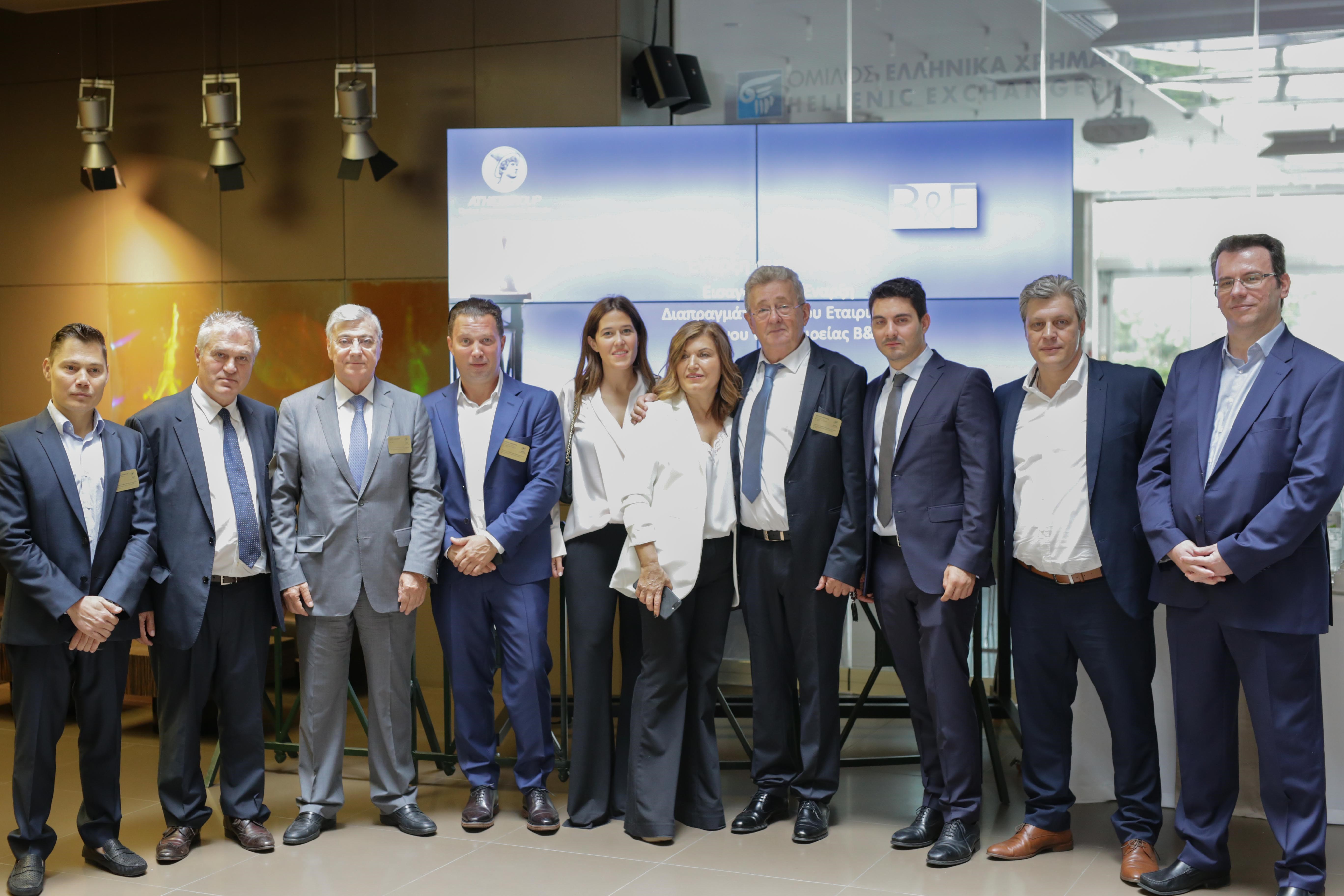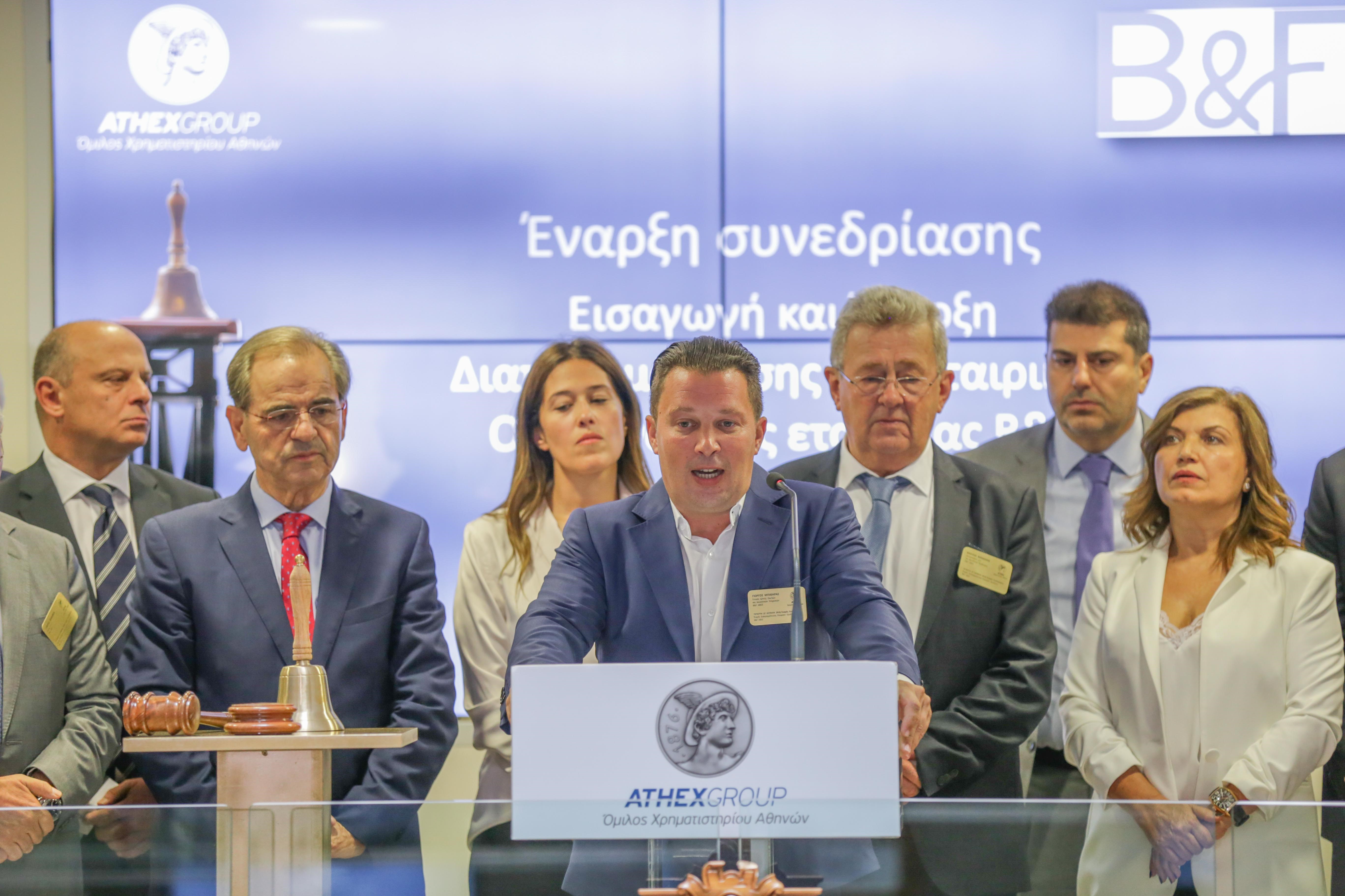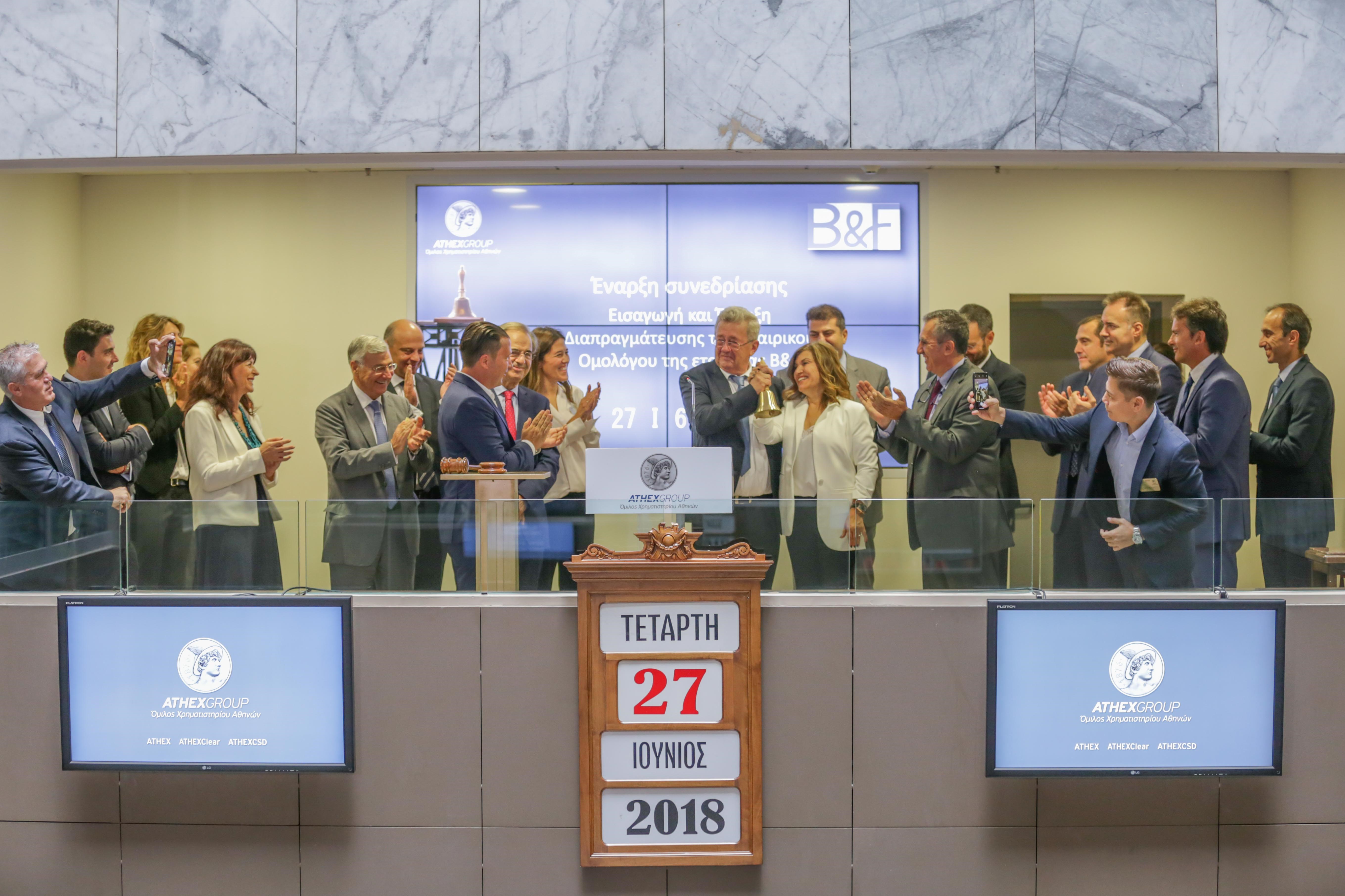 Το Χρηματιστήριο Αθηνών υποδέχθηκε σήμερα τον Όμιλο Εταιρειών B&F, στο πλαίσιο της εισαγωγής και έναρξης διαπραγμάτευσης στην Οργανωμένη Αγορά του Χρηματιστηρίου Αθηνών του εταιρικού του ομολόγου.