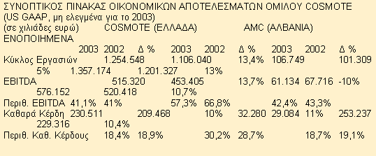 Διατηρώντας υψηλή κερδοφορία και με ισχυρές ταμειακές ροές έκλεισε η COSMOTE το 2003, όπως τεκμηριώνεται από τα οικονομικά της αποτελέσματα. Με κύριους μοχλούς την αύξηση της χρήσης στην Ελλάδα και τις σταθερές επιδόσεις της αλβανικής θυγατρικής, AMC, η COSMOTE επέτυχε το 2003 αύξηση του ενοποιημένου κύκλου εργασιών της κατά 13%. Παρά το γεγονός ότι η Εταιρία δραστηριοποιείται σε μια ιδιαίτερα ανταγωνιστική αγορά, και παρά τις συνεχείς μεταβολές του ρυθμιστικού περιβάλλοντος , που δεν ευνοούν την άμεση ετήσια σύγκριση, το περιθώριο κέρδους EBITDA της COSMOTE για το 2003 διαμορφώθηκε σε 42,45%.