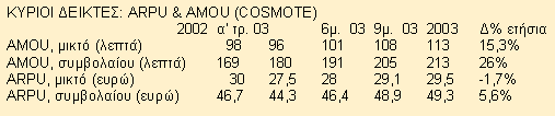 Η τάση αυτή για σταθεροποίηση του μικτού ARPU σε ετήσια βάση οφείλεται στη συνεχιζόμενη βελτίωση του δείκτη ARPU στους πελάτες με συμβόλαιο, ο οποίος ανήλθε σε 49,3 ευρώ, ενισχυμένος κατά 5,6% σε ετήσια βάση. Ο δείκτης ARPU στους πελάτες με συμβόλαιο για το δ' τρίμηνο του 2003 ανήλθε σε 50,5 ευρώ, ως αποτέλεσμα της προαναφερθείσας σταθερής αύξησης του δείκτη AMOU (δ' τριμ.), η οποία έχει σε μεγάλο βαθμό αντισταθμίσει την πρόσφατη αναπροσαρμογή των τιμολογίων της Εταιρίας και τη μείωση των τελών διασύνδεσης από σταθερό προς κινητό τηλέφωνο.