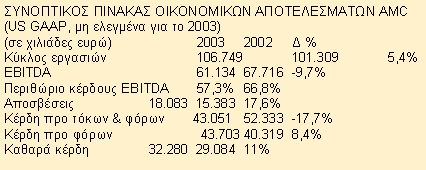 Κατά το 2003, η θυγατρική της COSMOTE στην Αλβανία, AMC, συμμετείχε στον ενοποιημένο κύκλο εργασιών της COSMOTE κατά 7,9% και στα ενοποιημένα κέρδη προ φόρων, τόκων & αποσβέσεων (EBITDA) κατά 10,6%.