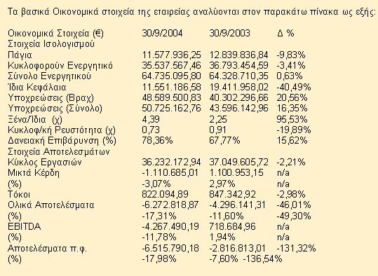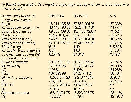 Ο Κύκλος Εργασιών στο 9μηνο 1/1-30/9/2004 σημείωσε οριακή μεταβολή και ανήλθε σε ευρώ 36,23 εκατ. έναντι ευρώ 37,05 εκατ. της αντίστοιχης περιόδου του 2003. Το μικτό αποτέλεσμα είναι αρνητικό ευρώ 1.110,68 χιλ. έναντι θετικού ευρώ 1.100,95 χιλ. της αντίστοιχης περυσινής περιόδου, γεγονός που οφείλεται στη παρατεταμένη περίοδο ισχυρποίησης του Ευρώ έναντι του δολαρίου με αποτέλεσμα τη μείωση της ανταγωνιστικότητας και βεβαίως την αναγκαστική μείωση των τιμών σε σχέση με τη προηγούμενη περίοδο, ώστε η εταιρεία να διατηρήσει τα μερίδια αγοράς που ως σήμερα κατέχει δεδομένου του αυξημένου ασνταγωνισμού από χώρες χαμηλού κόσοοτυς ('Απω Ανατολή). Επίσης η εταιρεία προχώρησε στη τρέχουσα περίοδο στη διακοπή λειτουργίας της μονάδας στη Νάουσα αφού απώλεσε έναν απο τους πελάτες της (ADIDAS), ο οποίος μετέφερε τις παραγγελίες του σε χώρες της 'Απω Ανατολής. Ως αποτέλεσμα αυτού, το τελευταίο τρίμηνο η εταιρεία επωμίστηκε το κόστος διακοπής της εν λόγω μονάδας και οι προσπάθειες επικεντρώνονται στην ανάκτηση του απωλεσθέντος κύκλου εργασιών που αναμένεται να εισρεύσει το νέο έτος. Κατά συνέπεια τα προ φόρων αποτελέσματα ανήλθαν στα ευρώ -6,52 εκατ. έναντι ευρώ -2,82 εκατ. το εννάμηνο του 2003. Βεβαίως το αποτέλεσμα της προηγούμενης περιόδου περιείχε και έκτακτα αποτελέσματα από πώληση ακινήτου. Το κυκλοφορούν ενεργητικό ανήλθε στα ευρώ 35,54 εκατ. έναντι ευρώ 36,79 εκατ. το 2003, μειωμένο κατά 3,41%. Αντίστοιχα, οι συνολικές υποχρεώσεις ανήλθαν στα ευρώ 50,73 εκατ. έναντι ευρώ 43,60 εκατ. το 2003, αυξημένες δηλαδή κατά 16,35%.