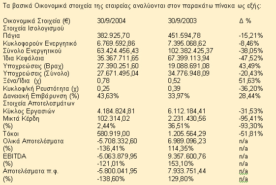 Στα πλαίσια της Απόφασης 5/204/14.11.2000 του Δ.Σ. της Επιτροπής Κεφαλαιαγοράς, καθώς και των σχετικών αποφάσεων της κείμενης νομοθεσίας με αφορμή τη δημοσίευση των λογιστικών καταστάσεων του 9μήνου 1/1-30/9/2004, σύμφωνα με το Π.Δ. 360/85, ενημερώνουμε το επενδυτικό κοινό και εσάς για τα ακόλουθα: