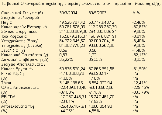 Όπως φαίνεται και από τον παρακάτω πίνακα, ο Κύκλος Εργασιών της εταιρείας κατά το εννεάμηνο 1/1-30/9/2004 διαμορφώθηκε στα 59,84 εκατ. ευρώ έναντι 87,87 εκατ. ευρώ το αντίστοιχο περυσινό διάστημα. Η μείωση αυτή του κύκλου εργασιών οφείλεται κυρίως στη μείωση των πωλήσεων βάμβακος και στην έλλειψη κεφαλαίου κίνησης, απαραίτητου να χρηματοδοτήσει μεγαλύτερο όγκο παραγωγής και πωλήσεων νημάτων, ως αποτέλεσμα διακοπής της παραγωγικής λειτουργίας ορισμένων μονάδων κατά την καλοκαιρινή περίοδο. Κατά συνέπεια τα μικτά αποτελέσματα περιορίστηκαν σημαντικά, γεγονός που οφείλεται κυρίως στη ως άνω μείωση του κύκλου εργασιών και επηρεάστηκαν επιπλέον πολύ αρνητικά από τον αθέμιτο ανταγωνισμό από τρίτες χώρες, ο οποίος εξακολουθεί να υφίσταται. Τα αποτελέσματα προ φόρων ανήλθαν σε ζημίες 26,49 εκατ. ευρώ έναντι κερδών 4,00 εκατ. ευρώ το αντίστοιχο περυσινό διάστημα. Στα αποτελέσματα της προηγούμενης χρήσης περιλαμβάνονταν και έκτακτα κέρδη ύψους 8,03 εκατ. ευρώ, ενώ στα αποτελέσματα της παρούσας, ζημίες από χρεόγραφα 7,9 εκατ. ευρώ. Ταυτόχρονα η εταιρεία μείωσε σημαντικά τις τραπεζικές της υποχρεώσεις.