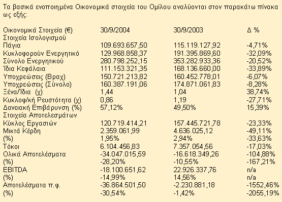 Όπως φαίνεται και από τον παρακάτω πίνακα, ο Ενοποιημένος Κύκλος Εργασιών της εταιρείας κατά το εννεάμηνο 1/1-30/9/2004 διαμορφώθηκε στα 120,72 εκατ. ευρώ έναντι 157,45 εκατ. ευρώ το αντίστοιχο περυσινό διάστημα. Η μείωση αυτή προέρχεται κυρίως από τη μείωση των πωλήσεων νημάτων και εκκοκκισμένου βάμβακος, για τους λόγους που αναφέρθηκαν παραπάνω. Κατ' επέκταση τα μικτά αποτελέσματα εκμετάλλευσης περιορίστηκαν σε 2,36 εκατ. ευρώ έναντι 4,64 εκατ. ευρώ το αντίστοιχο περυσινό διάστημα, κυρίως λόγω της συρρίκνωσης του όγκου και των τιμών πωλήσεων που απαιτείται ώστε να διατηρήσει την ανταγωνιστικότητά του ο Όμιλος σε όλο το φάσμα της κλωστοϋφαντουργίας όπου δραστηριοποιείται. Ο Όμιλος επέτυχε και περαιτέρω συρρίκνωση των διοικητικών και λειτουργικών του δαπανών ως προέκταση των οικονομιών κλίμακας που επιτεύχθηκαν από τις αναδιαρθρώσεις των τελευταίων ετών, οι οποίες και συνεχίζονται. Παρ' όλα αυτά, τα ενοποιημένα αποτελέσματα της περιόδου ανέρχονται σε ζημίες 36,86 εκατ. ευρώ, στις οποίες περιλαμβάνονται και ζημίες από χρεόγραφα ύψους 9,4 εκατ. ευρώ, έναντι ζημιών 2,23 εκατ. ευρώ, στα οποία όμως περιλαμβάνονταν και έκτακτα αποτελέσματα ύψους 10,1 εκατ. ευρώ.