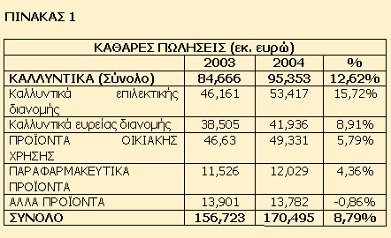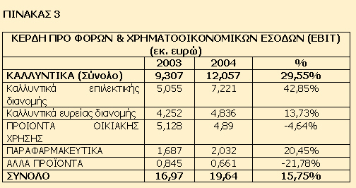 Εξετάζοντας τα κέρδη της εταιρίας προ φόρων και χρηματοοικονομικών εσόδων σε επίπεδο κλάδων δραστηριότητας, βλέπουμε ότι ο τομέας των καλλυντικών και ιδιαιτέρως τα καλλυντικά επιλεκτικής διανομής παρουσιάζουν υψηλούς ρυθμούς ανάπτυξης (+29,6%). Σημαντικός, επιπρόσθετα, είναι και ο ρυθμός ανάπτυξης που παρουσιάζουν τα παραφαρμακευτικά προϊόντα (+20,5%) για την εξεταζόμενη περίοδο. Η μείωση των κερδών, τέλος, στα είδη οικιακής χρήσης (-4,6%) οφείλεται στις αυξημένες δαπάνες υποστήριξης των προϊόντων αυτών στις αγορές της Αν. Ευρώπης με στόχο την αύξηση του μεριδίου αγοράς.