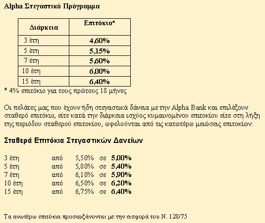 Σήμερα η Alpha Bank προχωρεί σε μείωση και στα σταθερά επιτόκια στεγαστικών δανείων. Συγκεκριμένα όσοι επιλέξουν το Alpha Στεγαστικό Πρόγραμμα εξασφαλίζουν τα χαμηλότερα σταθερά επιτόκια της αγοράς διάρκειας 3 έως 15 ετών ως ακολούθως: