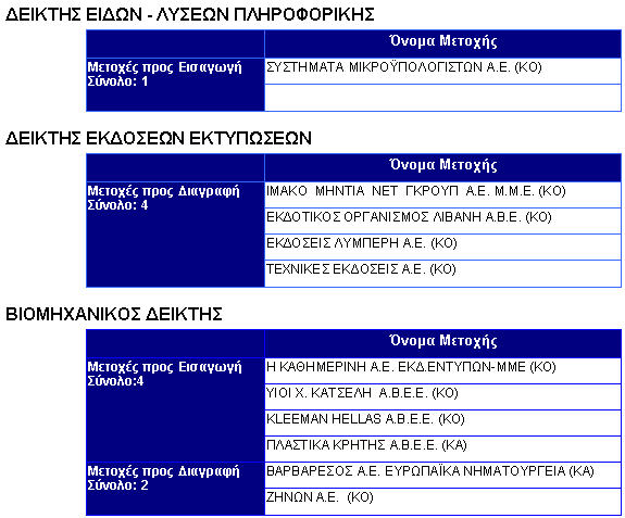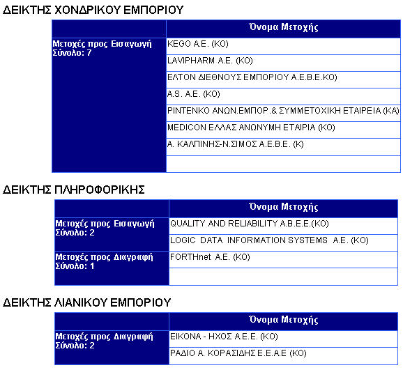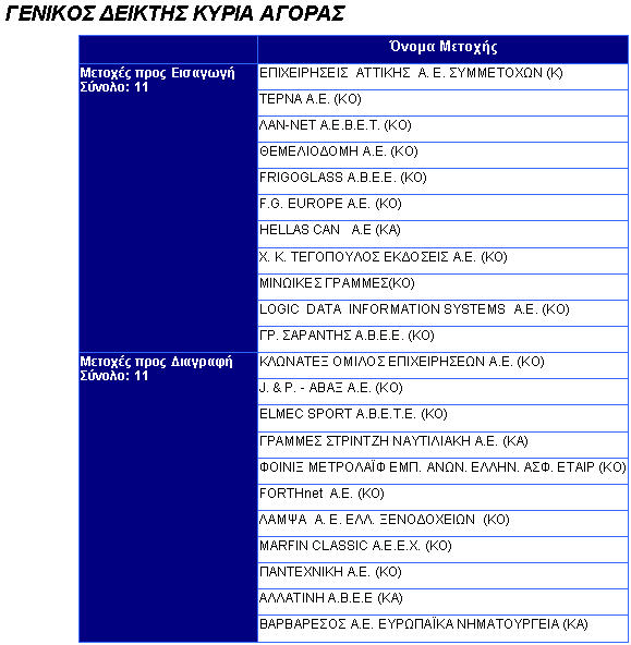 Η Επιτροπή Δεικτών στην σημερινή της συνεδρίαση ενέκρινε τις ακόλουθες αλλαγές στην σύνθεση των δεικτών του Χρηματιστηρίου Αθηνών όπως αυτές προκύπτουν κατ'' εφαρμογή των "Βασικών κανόνων διαχείρισης και λειτουργίας των Δεικτών". Υπενθυμίζεται ότι για τους Γενικούς Δείκτες η κατάταξη προκύπτει από τον αριθμητικό μέσο της σειράς διαβάθμισης κάθε μετοχής της ιστορικής αξίας συναλλαγών άνευ πακέτων του εξαμήνου 01/04 - 30/9 και της μέσης χρηματιστηριακής αξίας την ίδια περίοδο. Οι αλλαγές θα ισχύουν αμέσως μετά το κλείσιμο των εργασιών της συνεδρίασης της 7ης Νοεμβρίου 2003, δηλαδή την 10η Νοεμβρίου 2003.