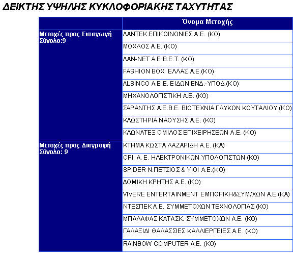 Με την νέα του σύνθεση ο Δείκτης Υψηλής Κυκλοφοριακής Ταχύτητας αντιπροσωπεύει πλέον το 1.54% της Μέσης Χρηματιστηριακής Αξίας των Αγορών Μακράς και Βραχείας Διαπραγμάτευσης και το 12.35% της Αξίας Συναλλαγών άνευ πακέτων των Αγορών Μακράς και Βραχείας Διαπραγμάτευσης για την υπό εξέταση περίοδο (01/04 - 30/09).