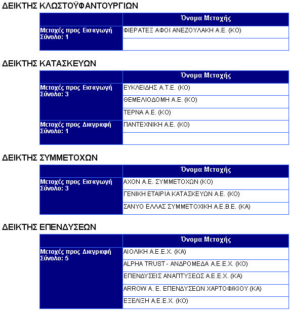 Δεν θα υπάρξει καμία αλλαγή στην σύνθεση των παρακάτω κλαδικών δεικτών του Χ.Α.: