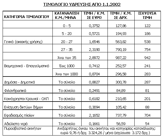Ακολουθεί πίνακας με το νέο τιμολόγιο ύδρευσης σε ευρώ και σε δραχμές.